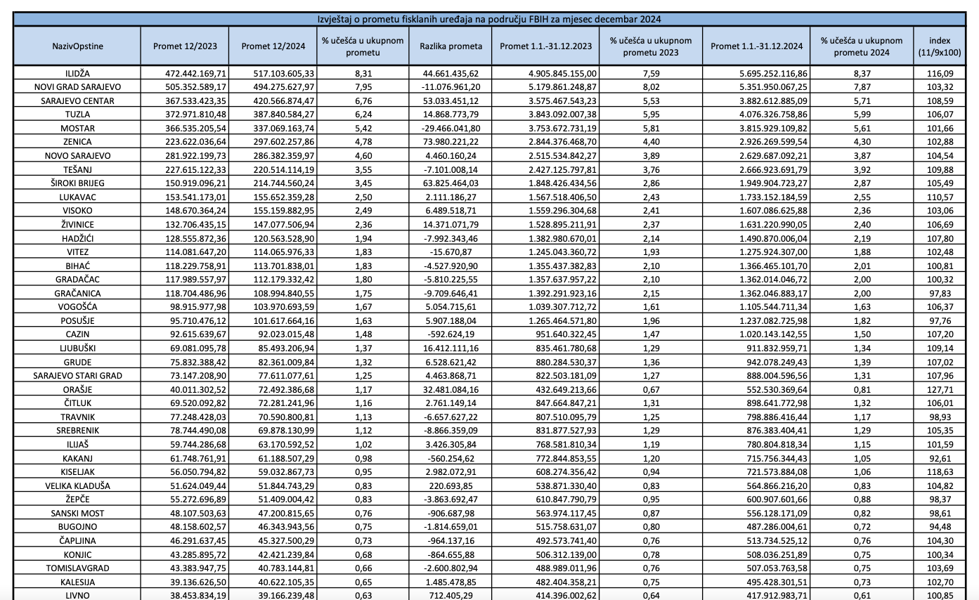 Općina na kojoj je evidentiran najveći ukupan promet putem fiskalnih uređaja u 2024. godine je Općina Ilidža na čijem području je evidentiran ukupan promet fiskalnih uređaja u iznosu 5.695.252.116,86 KM, što predstavlja preko 8% učešća u ukupnom prometu čitave Federacije BiH.