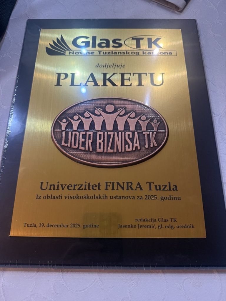 VIJESTI Univerzitet FINRA Tuzla nagrađen prestižnim priznanjem – Lider Biznisa TK 20 Decembra, 2025 Urednik Univerzitet FINRA Tuzla je nagrađen prestižnim priznanjem – Lider Biznisa TK u kategoriji visokobrazovnih ustanova za 2025. godinu. Ponosni smo što je naš rad i posvećenost obrazovanju prepoznata kako u akademskim krugovima, tako i u poslovnoj zajednici. Ova nagrada je rezultat zajedničkog rada svih zaposlenika, saradnika i partnera Univerziteta. Zahvaljujemo se na ukazanom povjerenju i podršci.